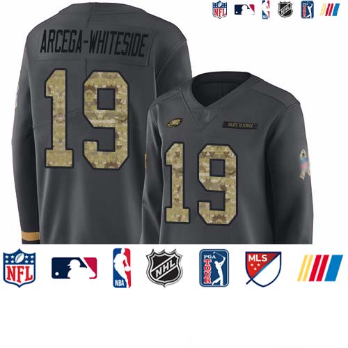 Eagles #19 JJ Arcega-Whiteside Anthracite Salute to Service Women’s Stitched Football Limited Therma Long Sleeve Jersey