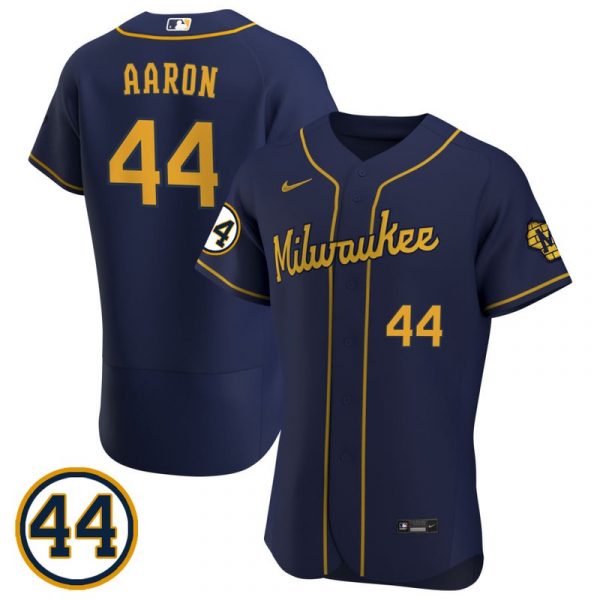 Men’s #44 Hank Aaron Milwaukee Brewers Cream Jersey Flex Base Navy