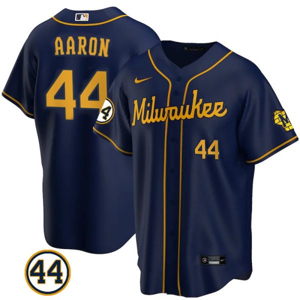 Men’s #44 Hank Aaron Milwaukee Brewers Gray Jersey Cool Base Navy