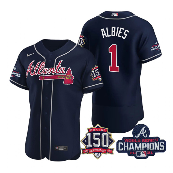 Men’s Atlanta Braves Ozzie Albies 2021 World Series Champions Stitched Jersey Flex Base Navy