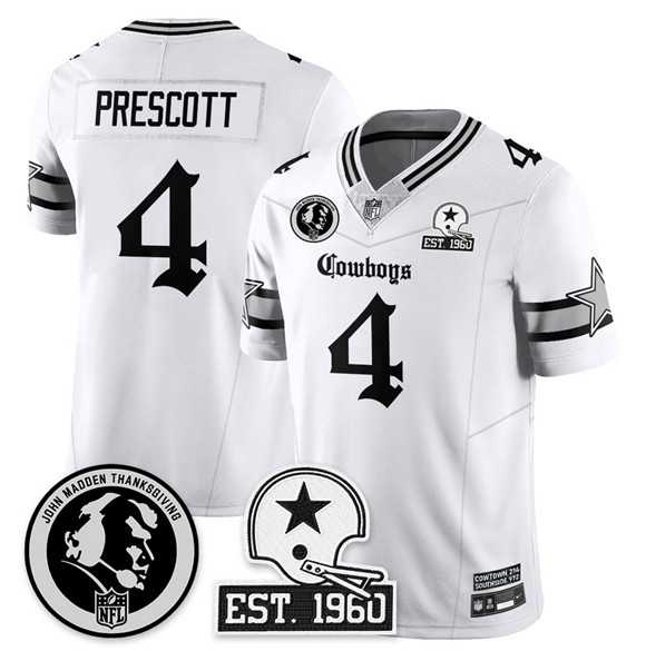 Men’s Dallas Cowboys #4 Dak Prescott White 2025 F.U.S.E. With John Madden Patch & Established In 1960 Patch Vapor Limited Stitched Football Jersey