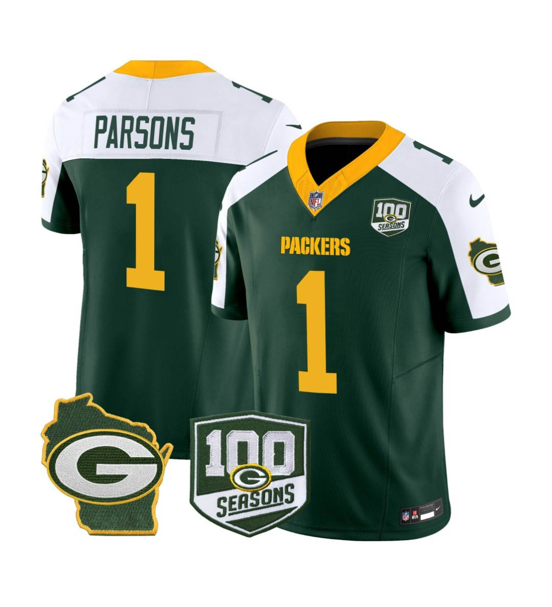 Men’s Green Bay Packers #1 Micah Parsons 100th Season Home Patch Green Vapor Limited Jersey All Stitched