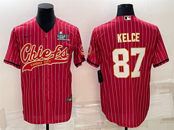 Men’s Kansas City Chiefs #87 Travis Kelce Red With Super Bowl LVII Patch Cool Base Stitched Baseball Jersey
