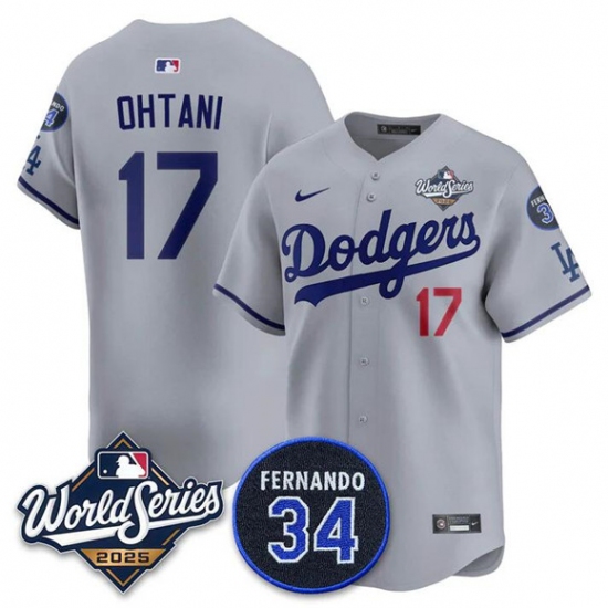 Men’s Los Angeles Dodgers #17 Shohei Ohtani Gray 2025 World Series With No. 34 Limited Stitched Jersey