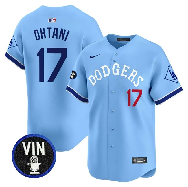 Men’s Los Angeles Dodgers #17 Shohei Ohtani Light Blue With Vin Patch Limited Stitched Baseball Jersey
