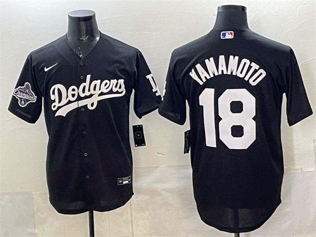 Men’s Los Angeles Dodgers #18 Yoshinobu Yamamoto Black 2025 World Series Champions Patch Cool Base Stitched Baseball Jersey