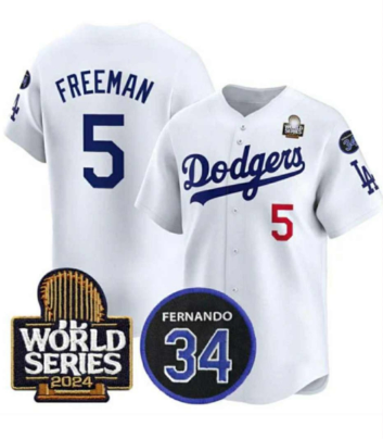 Men’s Los Angeles Dodgers #5 Freddie Freeman White 2024 World Series With Fernando Memorial Patch Limited Stitched Baseball Jersey