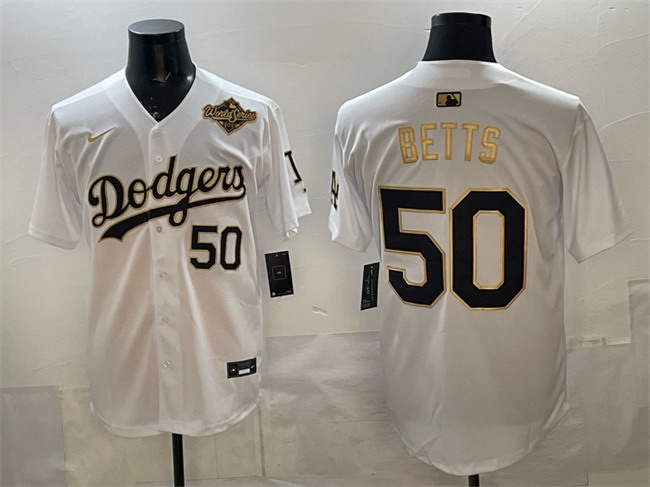 Men’s Los Angeles Dodgers #50 Mookie Betts White Gold 2025 World Series Patch Limited Stitched Baseball Jersey
