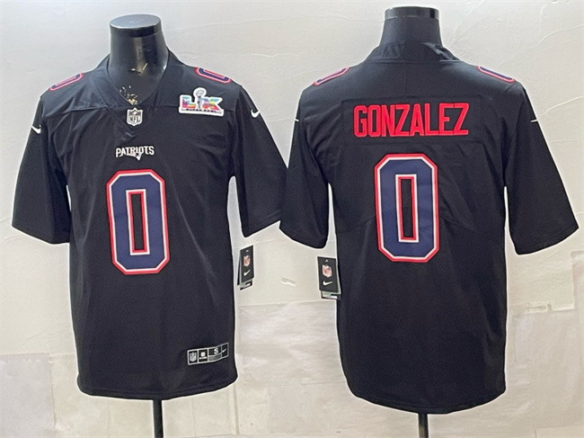 Men’s New England Patriots #0 Christian Gonzalez Black 2025 Super Bowl LX Patch Carbon Fashion Stitched Football Jersey
