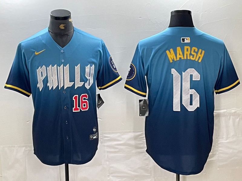 Men’s Philadelphia Phillies #16 Brandon Marsh Blue 2024 City Connect Limited Stitched Jersey