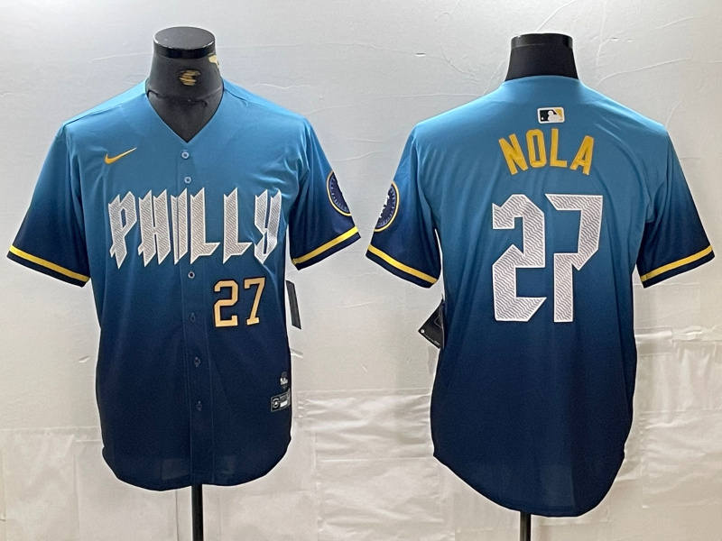Men’s Philadelphia Phillies #27 Aaron Nola Blue 2024 City Connect Limited Stitched Baseball Jersey
