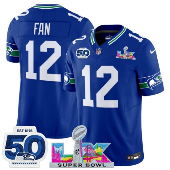 Men’s Seattle Seahawks #12 Fan Royal 2025 F.U.S.E. Super Bowl LX And 50th Season Vapor Throwback Limited Football Stitched Jersey