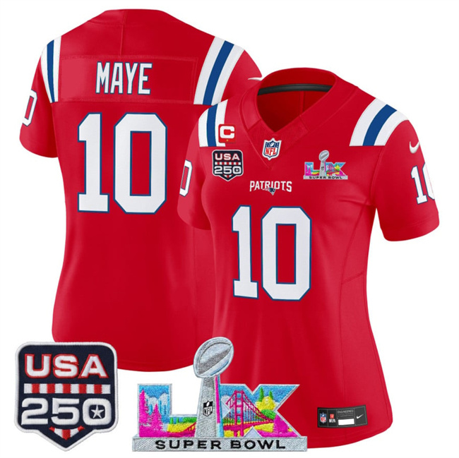 Women’s New England Patriots #10 Drake Maye Red 2025 F.U.S.E. 1-Star C Patch And Super Bowl LX Patch & USA 250′ Patch Vapor Limited Football Stitched Jersey(Run Small)