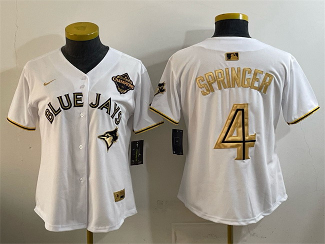 Women’s Toronto Blue Jays #4 George Springer White Gold 2025 American League Champions Limited Stitched Baseball Jersey(Run Small)